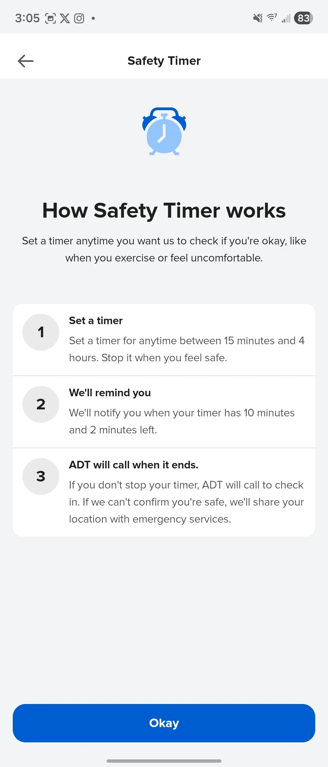 - Safety Timer: Enables proactive monitoring when users may feel vulnerable, with emergency services dispatched if check-ins are missed. Using the Safety Timer, an ADT agent can track your location during a set time interval.