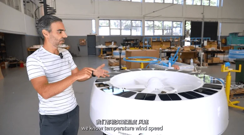 The energy side is central to the design. The system combines solar and wind power, with onboard batteries storing energy for use when needed. Sensors can capture data such as wind speed, temperature, and solar radiation, while the connected system allows operators to monitor performance remotely and build digital twins around installed units. Ruão also points to a practical advantage in the wind structure itself: airflow helps drive the turbine while also reducing the need to manually clean the solar panels.