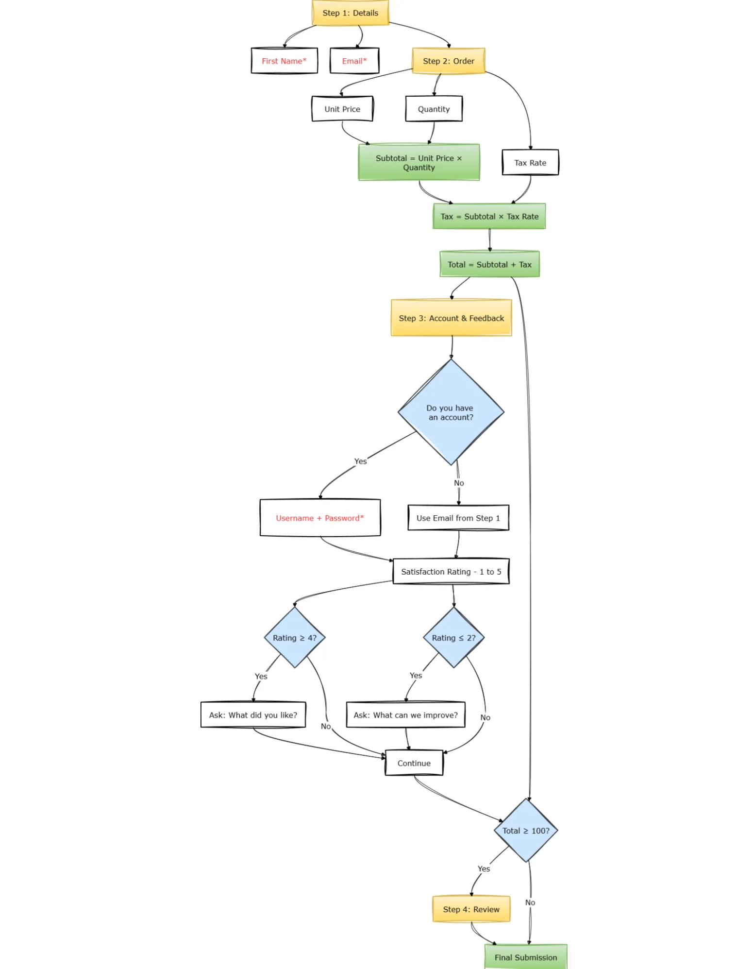 useWatch+useMemochain that computedsubtotal,tax, andtotalis replaced by threeexpressionfields that reference each other by name. - The review page condition, which in the RHF version was reconstructable only by tracing through
