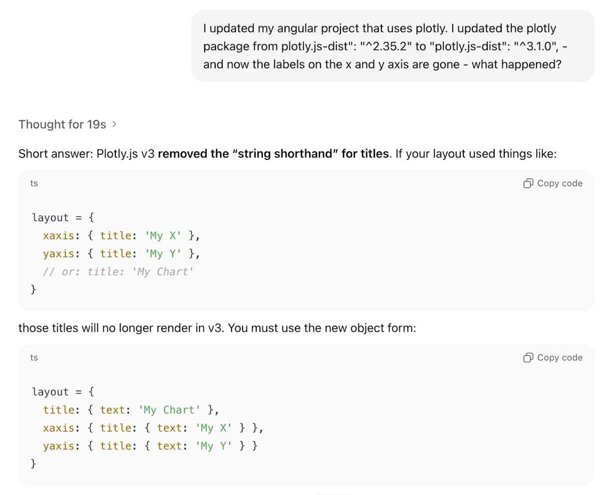 Updating npm packages, especially when they come with breaking changes, can be tedious and time-consuming work, and make you debug a fair amount of regressions. I recently had to upgrade the data visualization library plotly.js up one major release version from version 2 to 3, and as a result of that, the axis labeling in some of the graphs stopped working.
