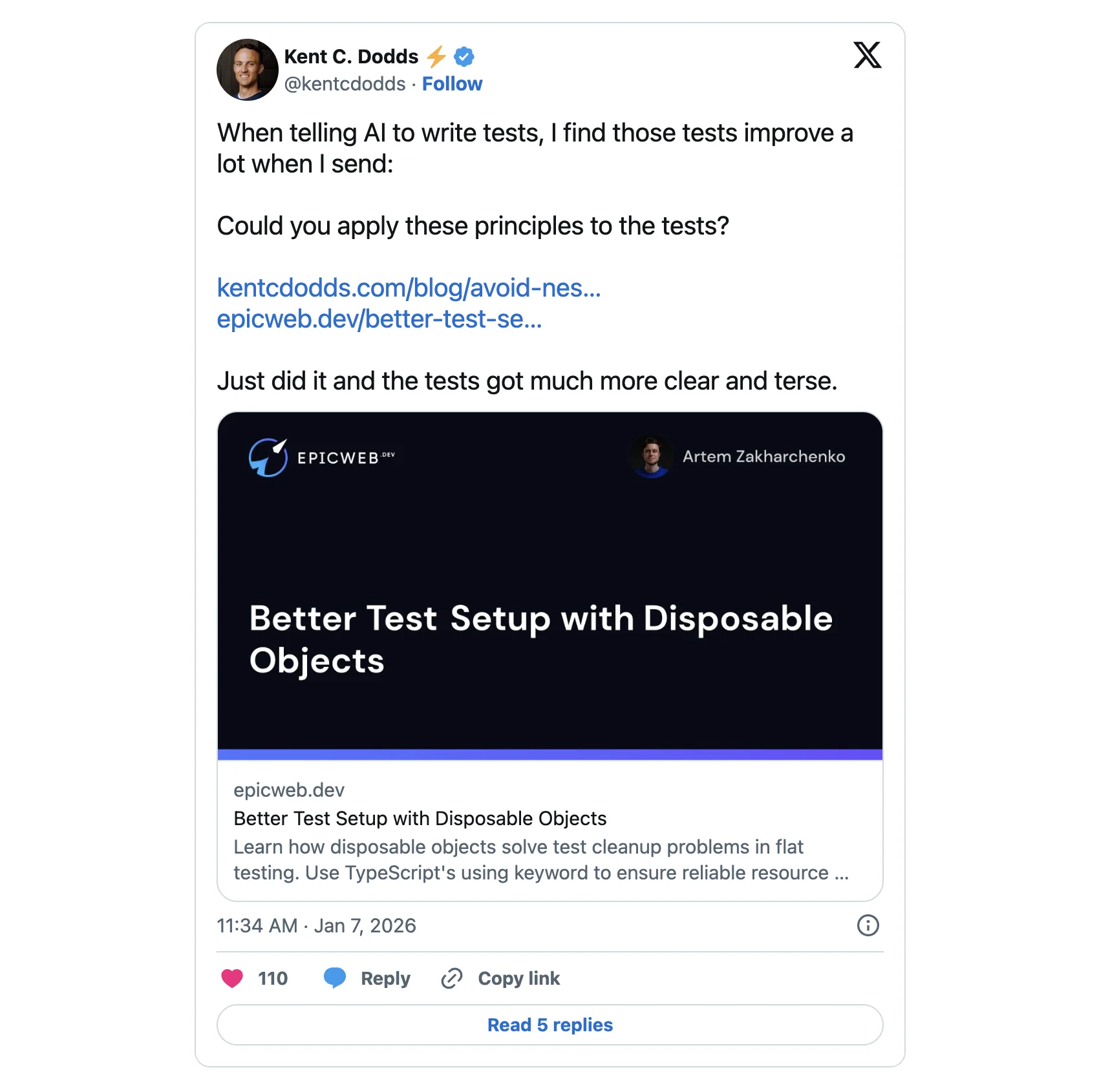 You can even pass along testing guru Kent C. Dodds’ testing best practices as guidelines to your agent, like below: