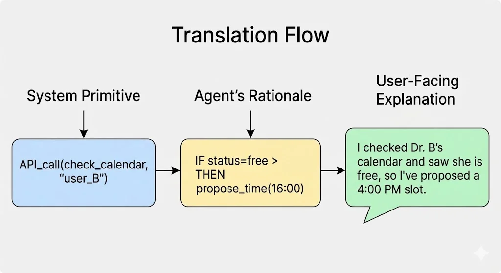 To achieve this, we must translate primitives into practical answers. In software engineering, primitives refer to the core units of information or actions an agent performs. To the engineer, this looks like an API call or a logic gate. To the user, it must appear as a clear explanation.